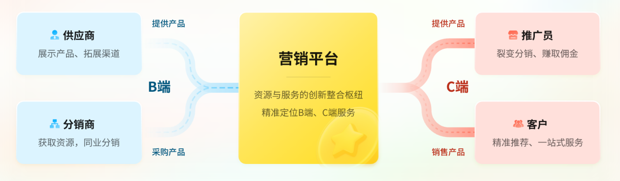 面對(duì)這些“散、亂、難”,行業(yè)開始尋找答案:一張能連接一切的“智慧之網(wǎng)”。這張網(wǎng),要能整合分散的資源(B 端供應(yīng)商),打通多元的分銷渠道(B 端分銷商),更要能精準(zhǔn)觸達(dá)和服務(wù)最終消費(fèi)者(C 端),形成高效協(xié)同的生態(tài)。它不僅僅是工具,更是賦能運(yùn)營(yíng)、激活價(jià)值的底層操作系統(tǒng)。