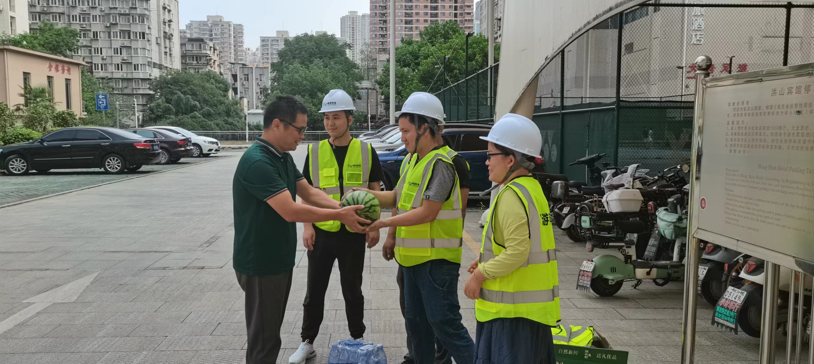 8月9日,數(shù)旅集團工會“關愛職工 夏送清涼”活動走進洪山賓館項目施工現(xiàn)場,為項目工地一線員工送去工會的關懷,現(xiàn)場發(fā)放西瓜、涼茶等防暑降溫物品。慰問組肯定全體參建人員不怕吃苦、迎難而上、艱苦奮斗的精神,同時勉勵大家要把握良好發(fā)展機遇,筑牢安全發(fā)展底線,確保項目如期完成。